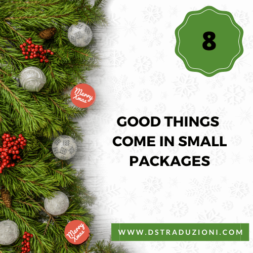 Questa frase e la sua variante big things come in small packages, significa che le cose belle non sono proporzionali alle dimensioni e quindi che anche un pacchetto piccolo può contenere qualcosa di prezioso (soprattutto se la carta del pacchetto è turchese con la scritta Tiffany sopra 🙂 ), che è anche un modo per dire che non bisogna lasciarsi ingannare dalle apparenze. È equivalente al proverbio italiano “nella botte piccola c’è il vino buono”.